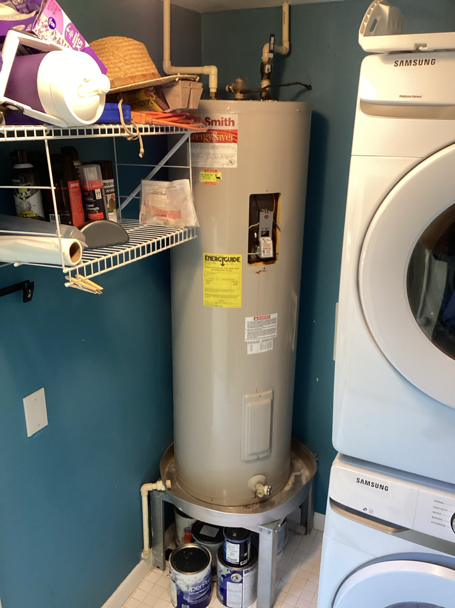 Once drained, we disconnected the electrical components, removed the unit from its stand, and hauled it away. We then installed a new drain pan and a new brass shut-off valve before setting the new 50-gallon electric water heater in place.